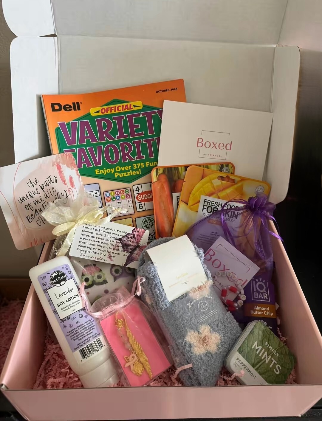 Boxed by an Angel founder, Cathy Angel, a breast cancer survivor, knows firsthand the emotional and physical trials of the journey. She understands the power of a thoughtful gesture and the healing energy of love and support. Each gift box is carefully and lovingly curated to offer comfort, inspiration—and a touch of luxury. From cozy items to calming teas, each item is selected with the intention of bringing comfort and joy to women undergoing cancer treatments and facing other hard times.