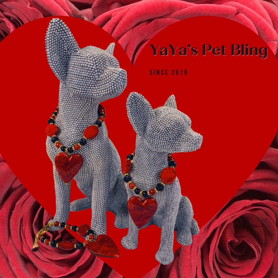 What is Valentine’s Day without bling? This YaYa’s Pet Bling custom made Valentine’s Day set was designed for a special person and their favorite fur baby. It is created with a red marbled heart pendant, red and black beads, gold colored accent spacers and hardware. Contact April Nichols at YaYa’s Pet Bling to have your own, custom-made set, for you and your fur baby(s).